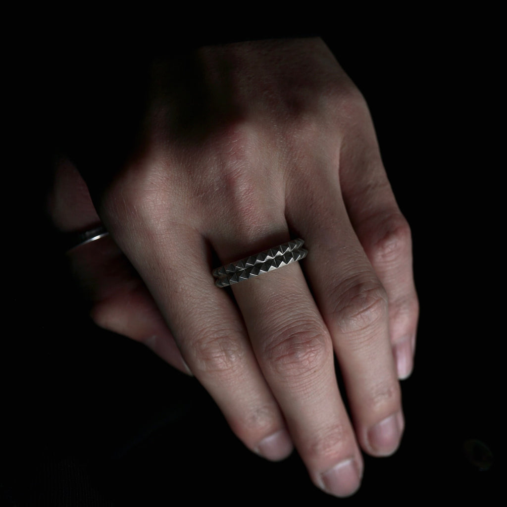 石を模した天面部分を含めリングと同一素材の SV925 を使用し、鋳造によって生じる特徴的なホワイトの色味と質感をそのまま採用したリング。