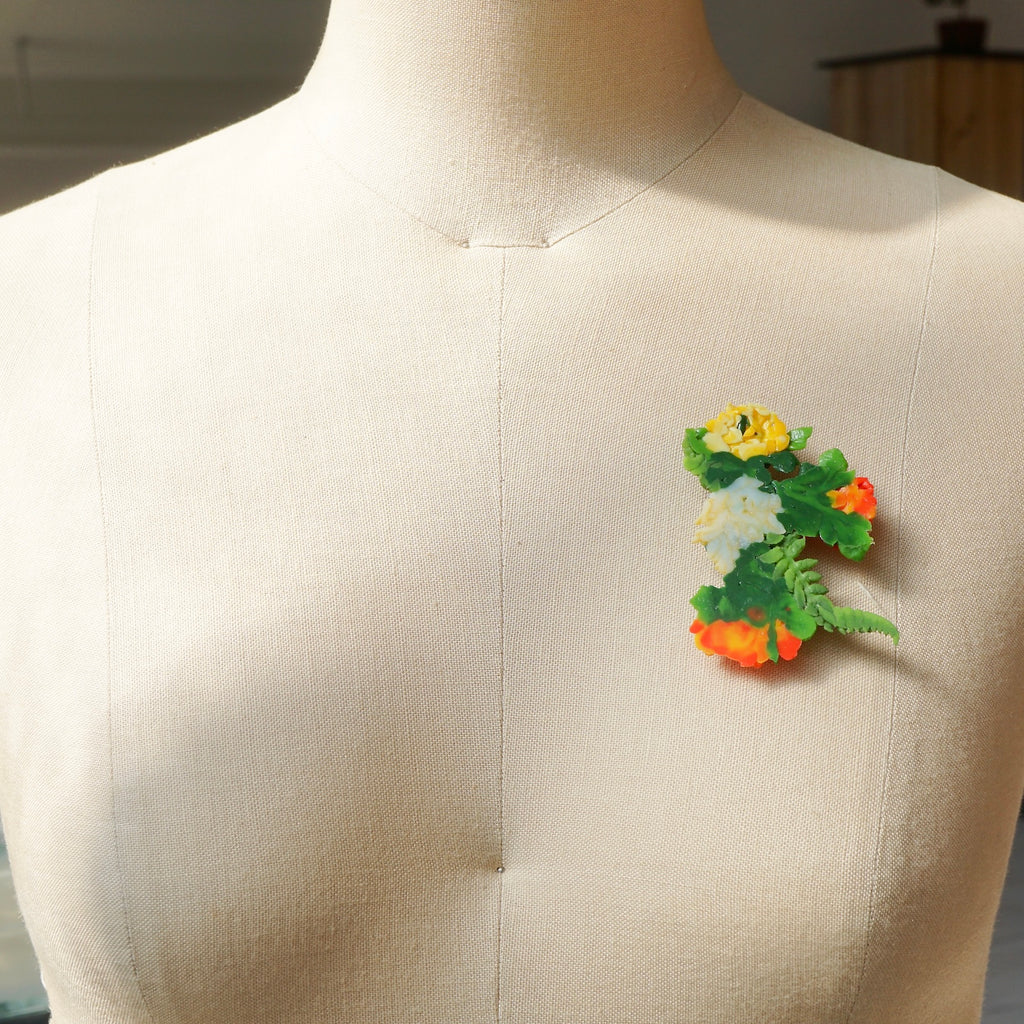 造花を熱収縮させることで、有機的なかたちへと再構築されたブローチ。